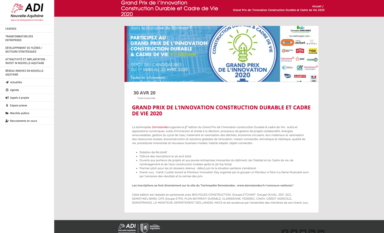 1 Avr 2020 Concours national, La technopôle Partager : Actualités ADI relaie l’Appel à projets du Grand Prix de l’Innovation 2020 DOMOLANDES/ 1st Avr 2020/ Concours national, La technopôle/ Partager : https://www.adi-na.fr/events/grand-prix-de-linnovation-construction-durable-et-cadre-de-vie-2020