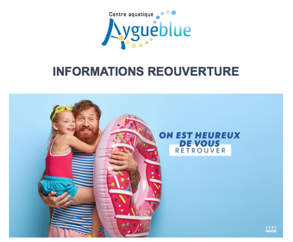 Bonne nouvelle : réouverture du centre aquatique Aygueblue : samedi 4 juillet 2020. L’établissement sera ouvert de 12h à 19h tous les jours jusqu’au 31 août.